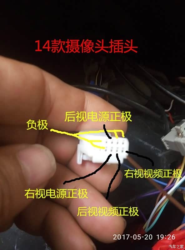 三个12v5脚继电器先用胶带捆绑到一起,然后按照我上面给出的电路图焊接,(14款和15,16款焊接是不一样的)。焊接好杜邦线后,14款车与摄像头插头对插,15,16款车与p20插头对插。对照上面的电路图插好插头(插好插头后用塑料胶枪和胶带固定,以免松脱。),接好线后用胶带捆绑固定到通用机尾线上。