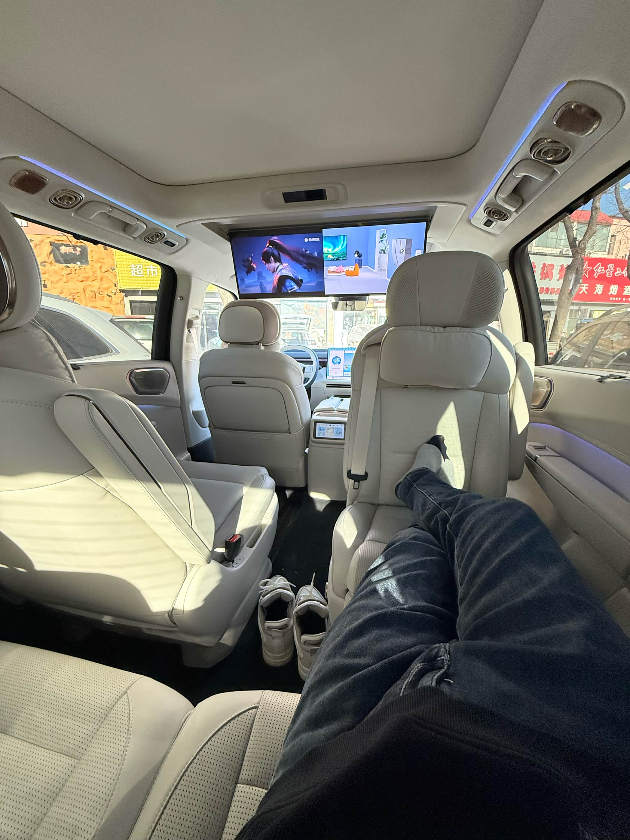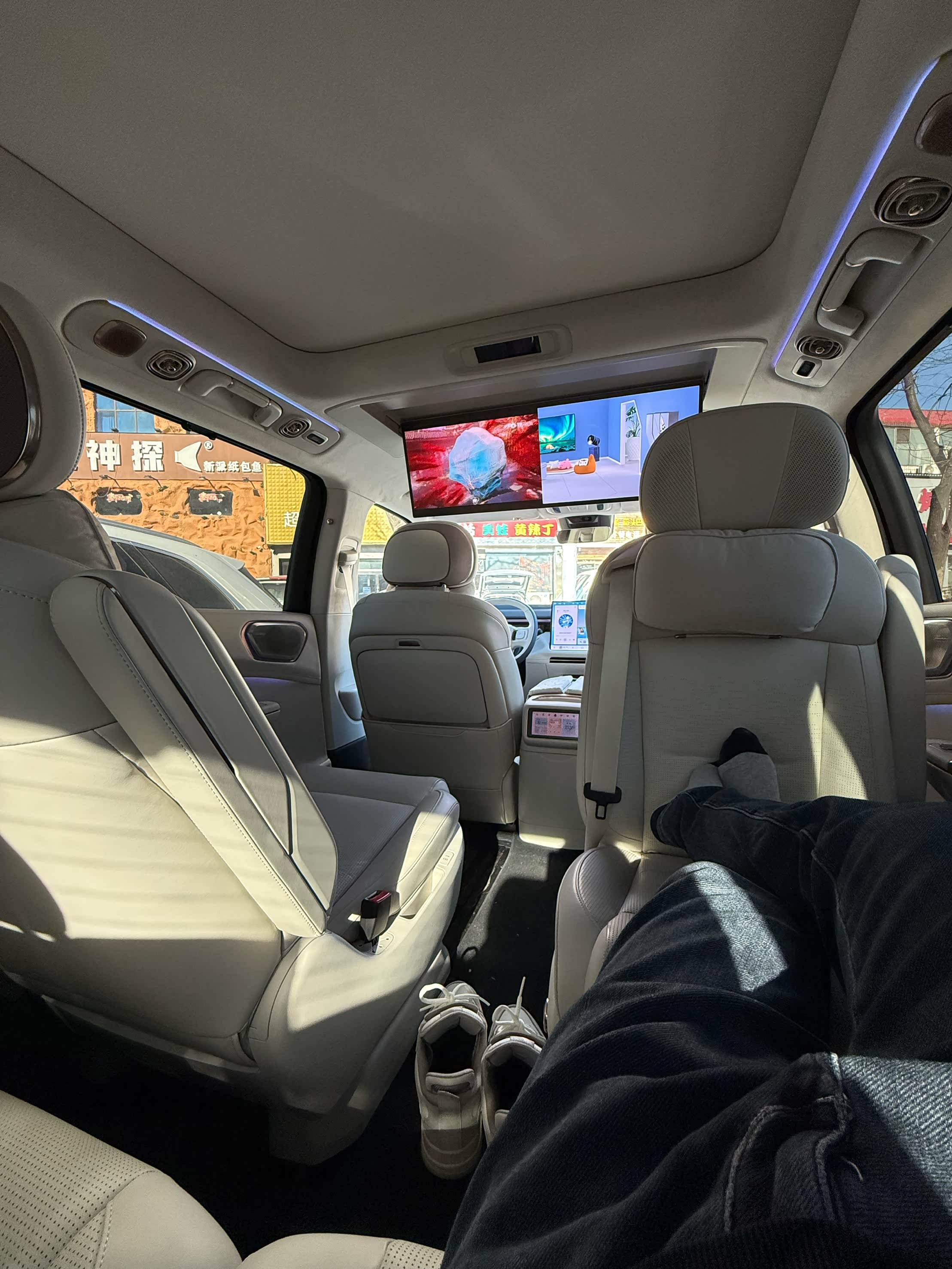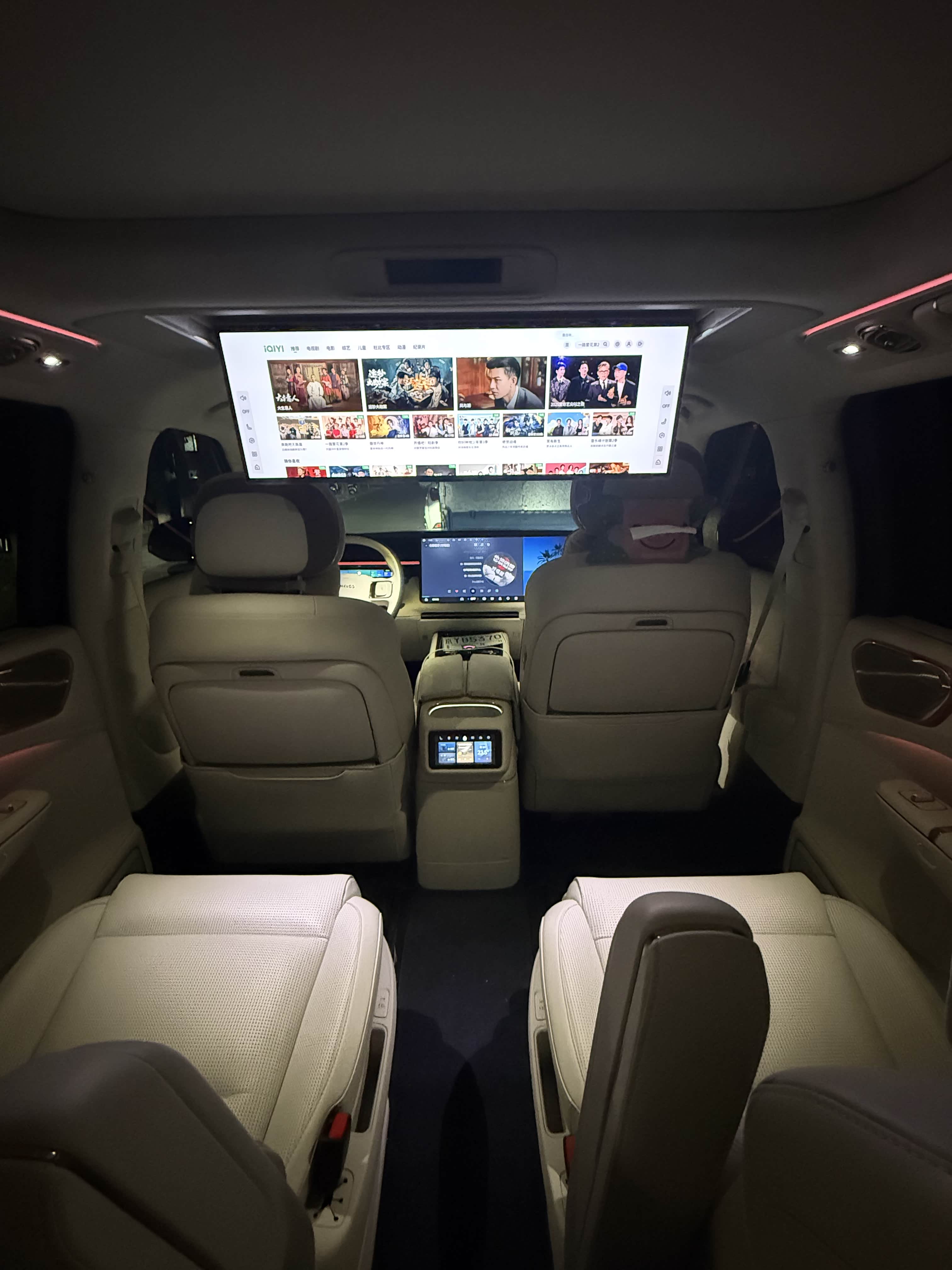 4️? 内饰:内饰配置方面算优秀,内饰用料在这个价位也是很不错的,新车没有什么异味。前排车机屏幕副驾可独立刷剧!后排还有超大的屏幕而且也可以左右独立播放视频!后排吸顶屏还有影院模式,在这个模式下看电影座椅会随剧情震动,很有震撼感!
