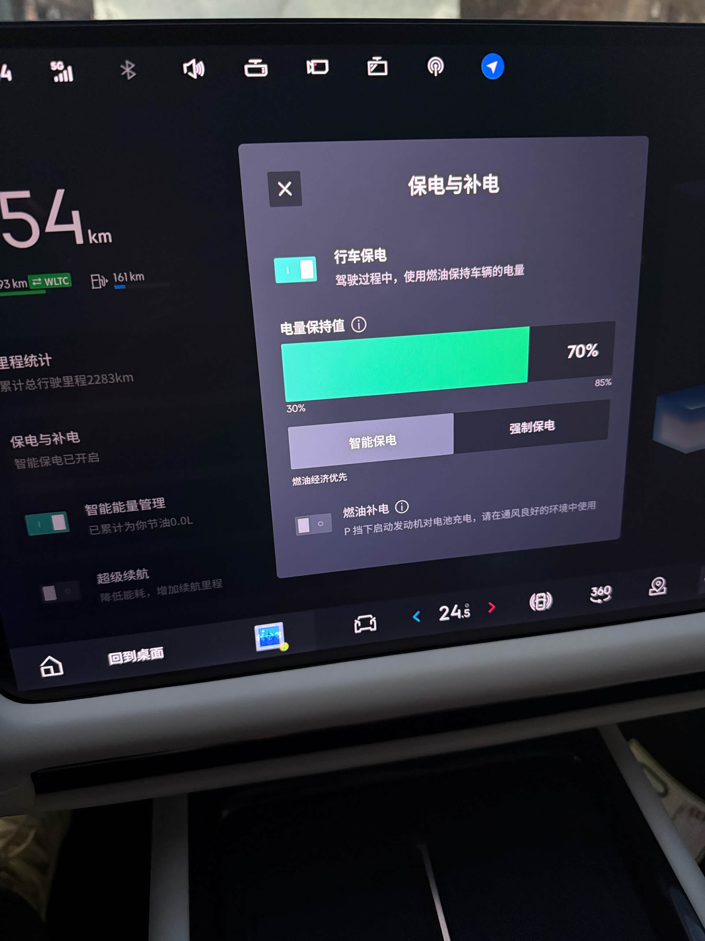 二、跑长途的话推荐使用智能电混模式,并打开智能保电,把保电设置高点,比如70%左右,这样发动机才会更早介入!这样避免了电量很低才会启动发动机!提升长途行驶时的能效!