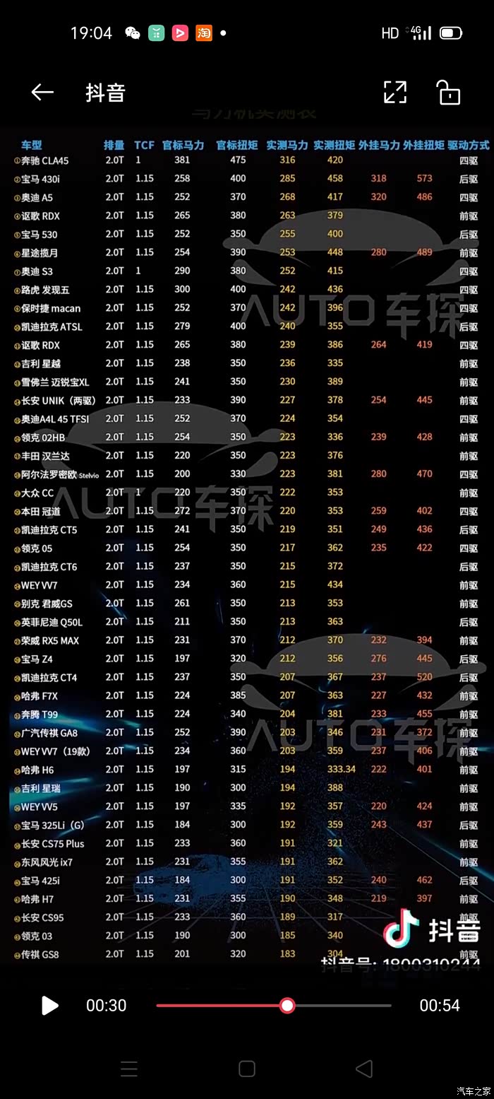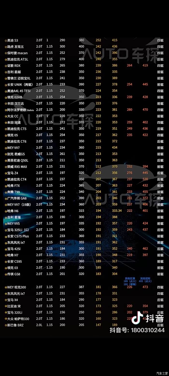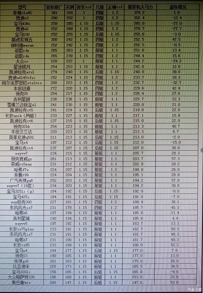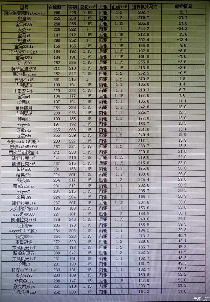 我发现抖音上车探测试动力时,tcf很多都设置错误了。他设置的1.15,实际上,后驱车才设置为1.15,前驱车应该是1.1,四驱车应该是1.2,这样反推出来的发动机机头马力才比较准。我用他给的2.0t车型的数据重新推算了一遍。谁才是真正的实打实,反向虚标王,谁家的2.0t发动机动力最强一目了然。