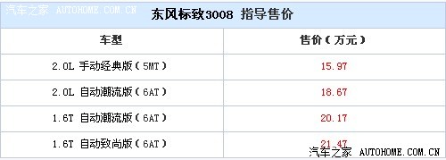 东风标致3008将于2013年1月9日正式上市,此前官方已经公布其售价区间16-22万元,最近又有国内媒体报道了这款车的详细售价16.98-22.98万元,不过这些也仅供参考,详细售价还要以上市为准。
