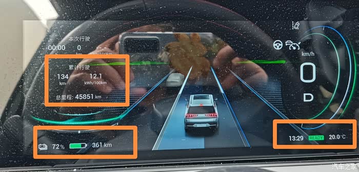 上午经过三个多小时行使,到达南阳后,走了134公里,百公里电耗12.1度,剩余续航361公里。134+361=495,可以看到温度升高后,续航明显提升,行使134公里,仅仅多消耗5公里。