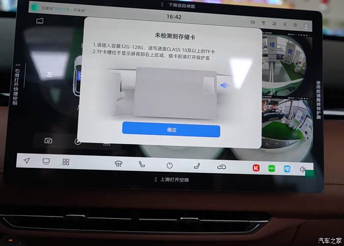 内置环视行车记录仪,送了一张32G内存卡,卡槽在大屏背后,按指示插卡即可。