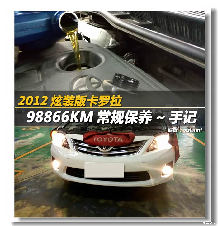 2012.5.3炫装版白色卡罗拉1.6MT一拖再拖,距上次保养里程又一万了(厂家建议每5000公里一次)。。。反正出了质保期,我的车我做主自己车也要自己爱惜,早上抽时间到裕华4S店去做了做。车子开着无不良反应,故只需做常规保养!上次保养作业:【定期保养】更换汽油滤芯。。。手记!http://club.autohome.com.cn/bbs/thread-c-526-47894948-1.html到达4S大门里程~~~98866KM!熟门熟路~~~直接开到保养接待处!依然找小孟接待开保养单子抄写里程表~~~做好防护措施——套上方向盘套、座椅套和手把套。。。工作做得很到位!开进保养工位~~~取出空调滤芯和空气滤芯。。。上次保养刚换的,已经很...