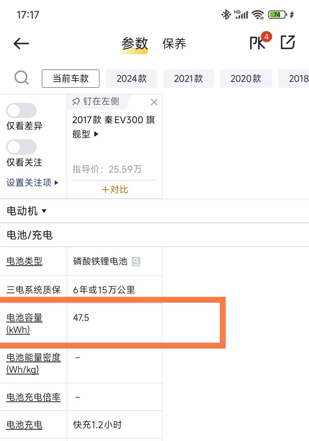 我的第二辆新能源车,是 2017 年 9 月在北京通州入手的秦 EV 300 旗舰型。在我国新能源汽车发展历程中,这款车属于第二代纯电动车。新车到手时,官方标称的电池信息显示:采用磷酸铁锂电池,电池容量为 47.5Kwh 。