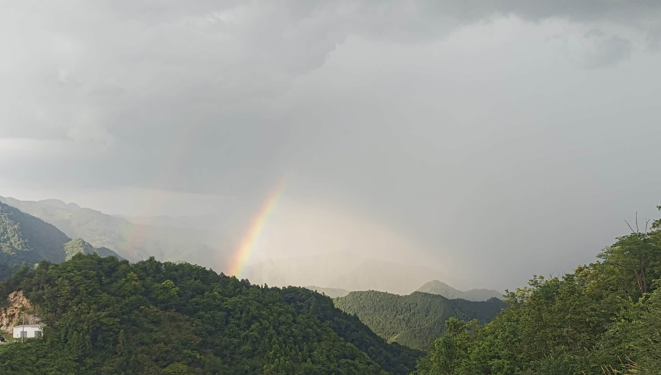 狂风卷着乌云扑面而来,豆大的雨点噼里啪啦砸落,紧接着雷声滚滚,倾盆大雨瞬间笼罩山野。我们慌忙收起零碎物件,一头扎进深蓝S09里,锁上车门的瞬间,外面已是风雨交加。索性打开全景天幕,看着雨帘疯狂拍打在玻璃上,远山在雨雾中若隐若现,车内却温暖又安静,S09像一座坚固的避风港,稳稳护着我们一家周全。约莫半小时后,雨势渐歇,阳光刺破云层洒下,转头望向远处山巅,一道绚烂的彩虹凌空架起,红橙黄绿青蓝紫层次分明,衬着湿漉漉的青山,美得让人挪不开眼。果然,风雨过后的彩虹才更显珍贵,这意外的美景成了旅途里最惊喜的彩蛋。