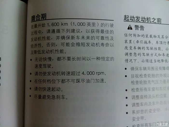 一辆车磨合的好和不好,跟以后车好开不好开有很大的关系,一般新车在300公里以内不超过60码,300公里-800公里不超过80码,800公里-1500公里不超过90码,建议1500公里做首保,做完首保后车速度不要超过100码开到5000公里,5000公里-10000公里不要超过120码,新车期间油门轻踩,刹车轻刹(忌踩急刹车),楼主你的车是自动挡的还是手动档的,如果是自动挡的在一般的道路上开建议D2档起步,时速超过20码挂D档,如果是手动档的,那就1档起步,换档一般是在发动机的转速在2500转至3000转之间换档,还有在保修期内按照厂家要求该保养就保养,该换的就换,不然你的车万一有什么小毛病,厂家会以你不按照他们的保养方式保养来拒绝你的索赔,过了磨合期以后,车子一定要上高速去拉一拉,能开多快就开多快,如果自己怕,可以找个老驾驶员帮你开,磨合期过了以后,只要做完保养,从4s店一出来就要拉一下高速,让刚换的机油能充分在你车的发动机里润滑到位,还有建议过一段时间跑个长途,因为如果经常只在城市里开短途的话,排气管里容易积水,跑长途可以把水化成水蒸气蒸发掉,不然排气管容易腐烂,以上都是我个人心得,希望能帮到你,仅供楼主参考!