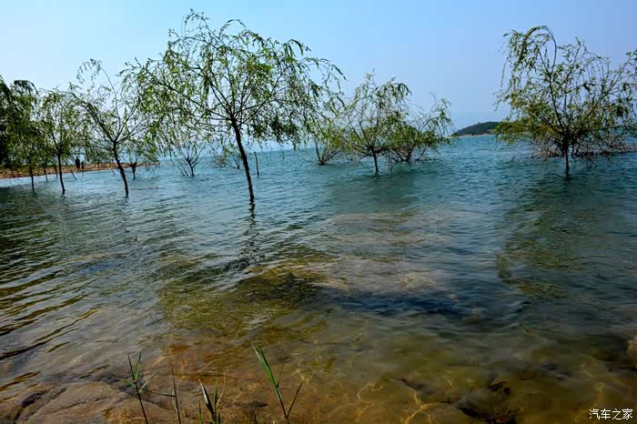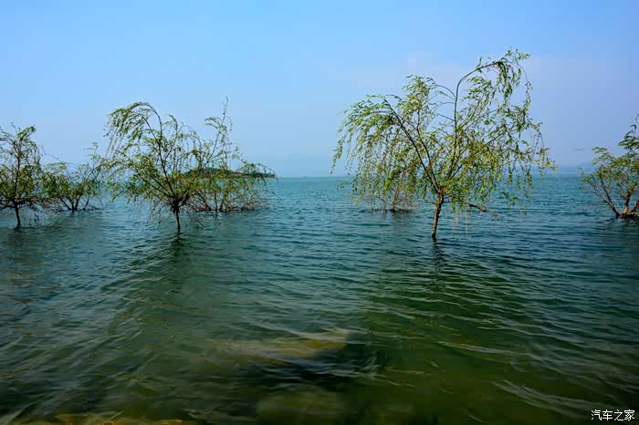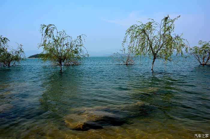 站在坝顶远眺青山碧水蓝天白云,水质清澈见底,各式各样的灌木与乔木生长在水边甚至水中央,阳光下由远而近水面呈现一种从浅绿到蓝色的渐变,微风吹过,水面上远山及各色树木的倒影微微晃动,真是恍若人间仙境。
