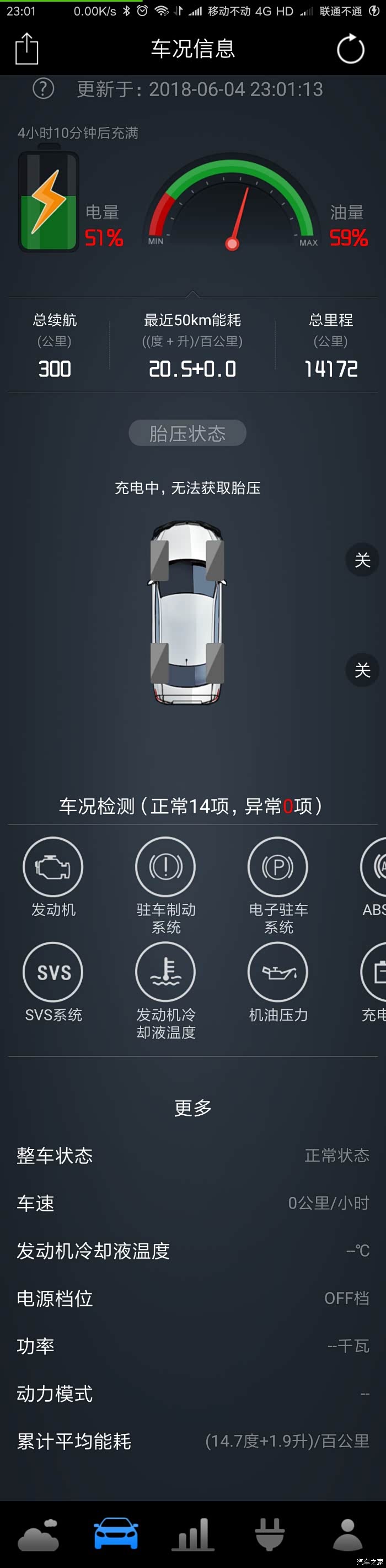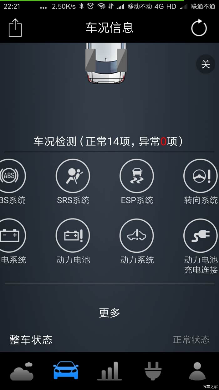 中间是胎压数据和14项主要的车况信息,这些都是与我们的安全息息相关的,每次刷新(右上角那个带圈的剪头)都会自动逐一进行检测,如有异常会显著显示并进行提示。