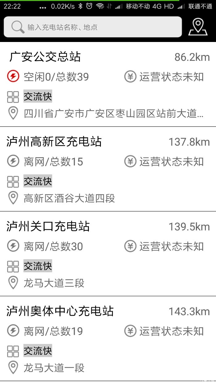 点击右上角的切换按钮,可以将充点电显示方式由地图形式切换成列表形式。