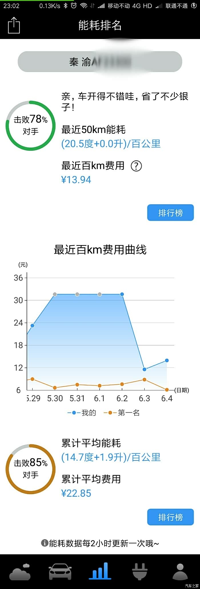 点击排行榜按钮就可以进入你自己车型的能耗、费用排行榜,共有两个榜单,一个是近百公里能耗、费用排行榜,另一个是累积平均能耗、费用排行榜。