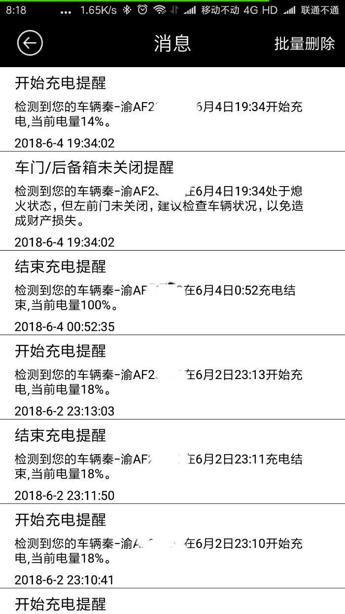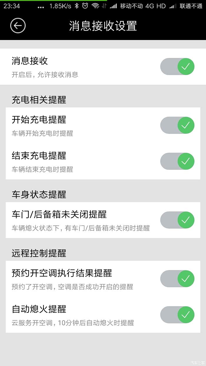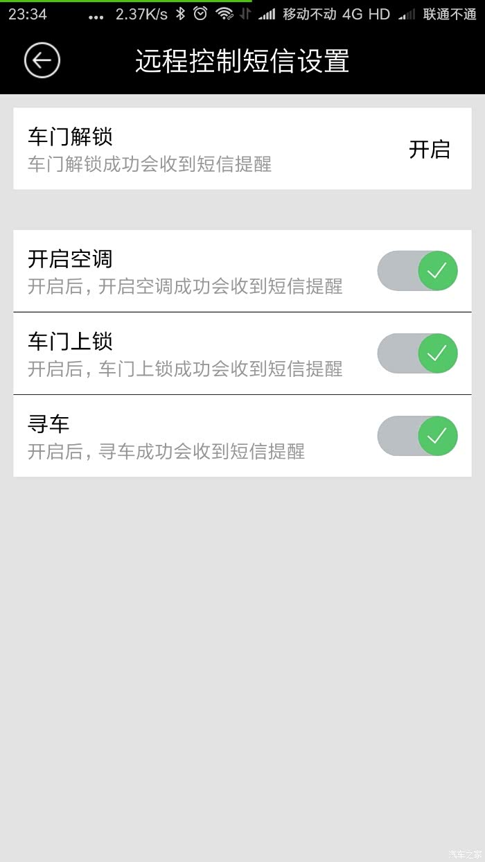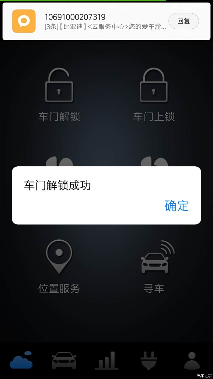 点击车门解锁,会弹出解锁成功或失败的提示,都是这个界面,这是车门解锁成功的通知,同时会短信通知(这两个通知都是可以设置的,具体设置方法后面详细介绍)。车门上锁也是一样的。