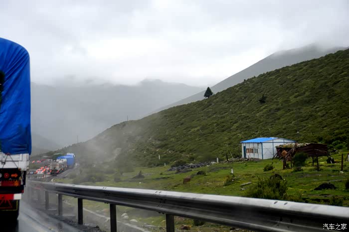 在下山的途中遇见了堵车,天还下着雨,堵了两个小时。这时头有点疼,这也许是上到了四千米以上的高原反应吧,赶紧吃了点药。道路在天黑之前慢慢疏通了,我们紧赶慢赶,由于晚上能见度太低,还下着雨,为了安全起见,就在距新都桥几公里的一个客栈入住了。