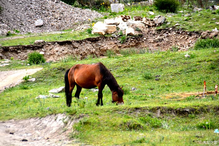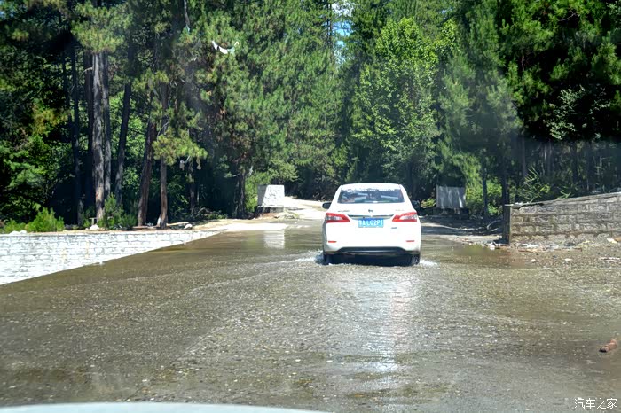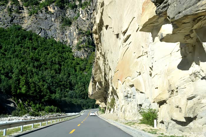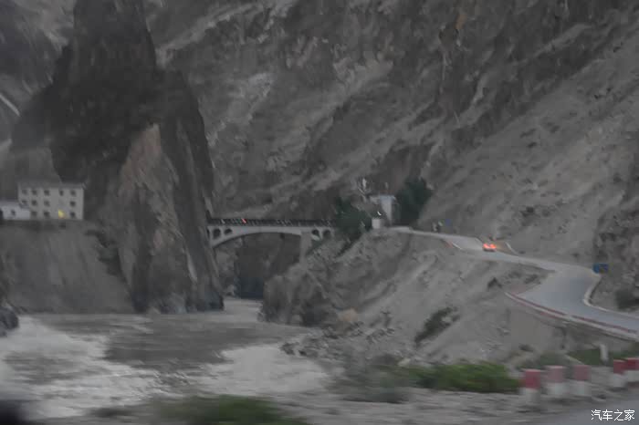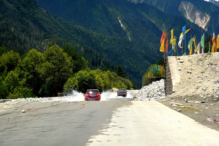 过了米堆冰川向前行驶不久追上前面一辆郑州牌照的轿车,于是相互打了招呼,商定一路行驶,同是轿车,相互有个照应。快到波密的时候到了第一个涉水路面,水不是很深,但阻力还是很大的,抵挡大油门顺利通过。道波密准备加油,可加油站的人太多,我想到通麦再加吧(谁知这是个很大的失误)。等过了波密发现老乡没跟上,打电话说在等着加油呢,人太多让我先走。我当时急着到通麦加油就先走了。谁知到了通麦一看傻眼了,通麦根本没有加油站,又赶上堵车,车里有已经不多了,很是担心,问当地人鲁朗有没有加油站,回答只有八一有加油站。心想这下完了,车里的油最多跑到鲁朗,搞得心情非常不好。在通麦大桥前堵了一个多小时,终于上桥了,过了大桥不久,两个隧道都通车了。可是到第三个隧道还没有通,路非常难走虽然没有下雨,路还是高低不平。在一个上坡又拐弯的路段由于前面堵车,导致小三在半坡起步时打滑熄火几次差点没上去,最后往后倒了一点,加足油门,也不管托不托底硬是冲了上来。这段路导致小三托底两次。如果是雨天小三过这段路是很困难的,好在第三个隧道也即将通车,以后通麦天险就不存在了。