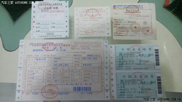 2、海南轮渡费1056元(单程汽车含司机419元,乘客42元/人保险来回50元)
