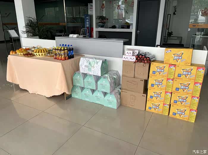 这是4S店给我们准备的礼品,还准备了各种水果,零食,饮料,很期待呢,不知道等会能不能抱个大奖回家