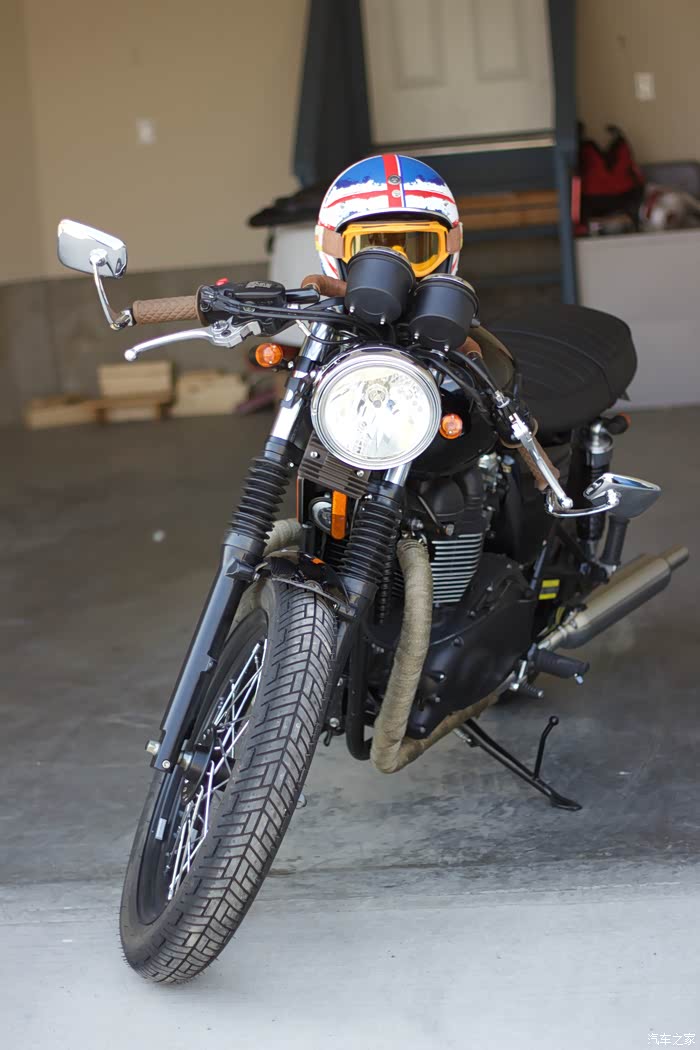 这个就是楼主的2015 bonnie。可以看到,stock handle bar已经替换成了clubman bar,品牌是biltwell(小贝同款,哈哈)。在handle bar的中间位置,我已经用碎皮包裹起来,主要为了美观。有需要的同学可以到ebay去搜索一下leatherscraps. 去淘宝也可以,大概几十块钱可以买好多。