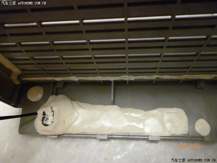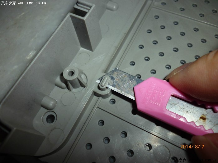 前部是出风口但是只有下半部有孔,上半部的商标我还想保留,拿刀割下
