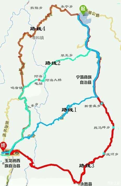 泸沽湖—翠玉乡100km(宁泸公路/S307—红翠线)—阿海电站35km(翠依线—东联线)—鸣音乡25km—大东乡35km—丽江45km(S208)
