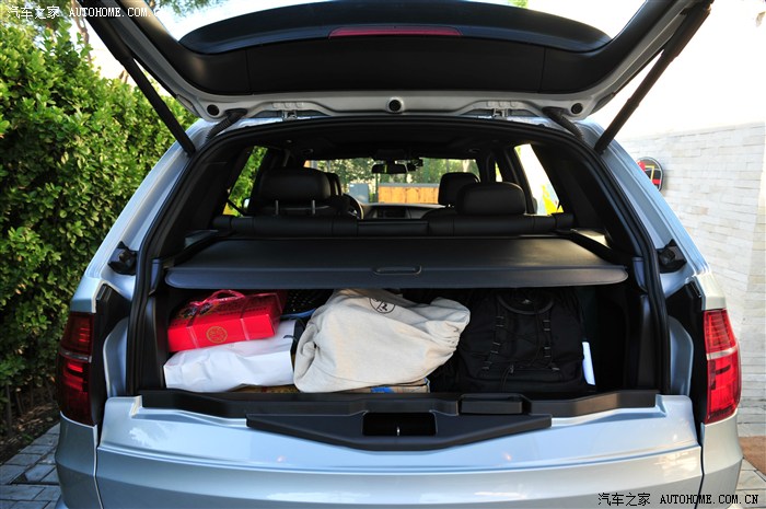 X5M的后车门分上下两部分开启, 容积还不错, 行李放置完后我将卷帘式盖板拉出并挂到支架上, 这个有两个用意,一个是防止高速路上遇到紧急情况刹车时防止行李弹到前面影响成员安全, 另一个就是防止贼惦记了, 按常理分析一般小偷只有看到车内有东西才会冒险去砸车.如果不能确认有东西估计他们很少会出手.