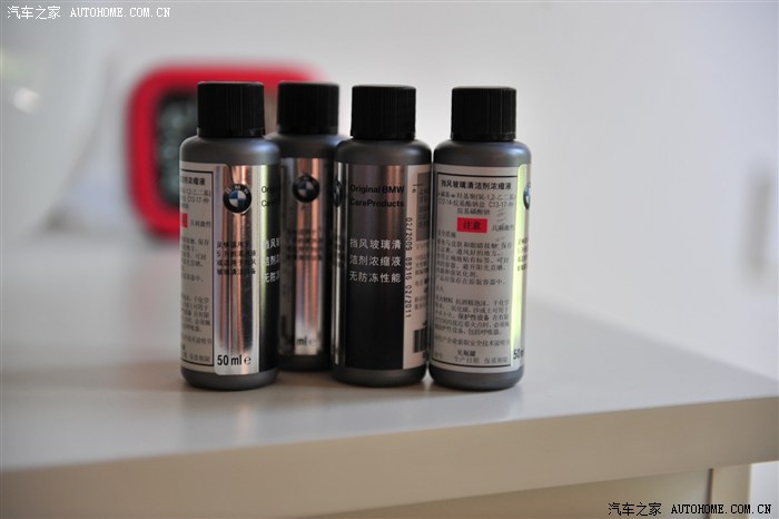 邻居还给了些宝马赠送的挡风玻璃清洁剂浓缩液, 这个很简单, 每瓶混合5公升的清水就变成了挡风玻璃清洁剂, 我将之倒入了车上的清洗液加注管内即可, 注意这个浓缩液没有防冻功能,冬季寒冷地区是不能使用的.