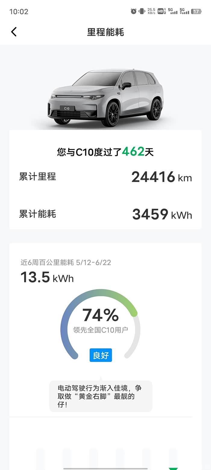 开零跑C10也有1年多时间了,C10的动力也是可圈可点,平顺性、加速超车也是以前我的油车不能比的,更关键的是开了这么久,总体用车下来续航方面还是很可靠的,我的综合能耗在13-16左右,总体九折,当时买C10的时候,路上很少看到零跑的车,现在等红绿灯都能碰到车友,最近零跑的第80万辆正式下线,从50万台到70万台,用了6个月时间,从70万到80万,只用了两个月时间,这速度太快了,侧面说明消费者认可产品的质量和可靠性,作为老车主来说保有量的增加,不管是售后服务网点,还是配件,都会越来越实惠,我们也非常开心。