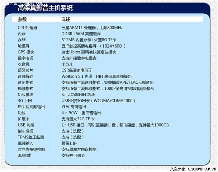 主机,这个应该只是winCE系统的主机,主频800Mhz,内存256M,单纯看主频和内存说的过去吧,比原来用的徐港的高一点(600Mhz/128M),个人认为应该再强大一些。比较有优势的地方是支持HIFI音频解码,支持播放无损音乐格式,实际用了之后感觉这个音响效果确实比原来好很多。