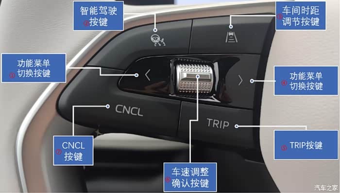 ④ 功能菜单切换按键:向右切换智能巡航辅助系统/自适应巡航控制系统(ACC)功能。