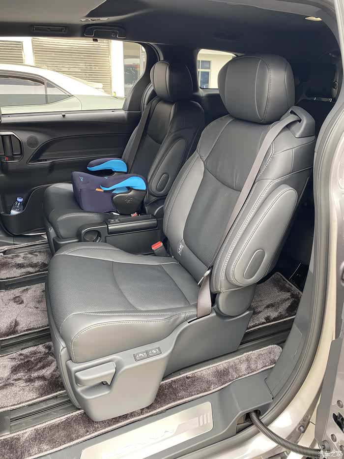 这里比较遗憾的是三排座椅切角和仅有42cm左右深度,哪怕个子不高的大人乘坐都觉得大腿承托不足,外加左侧轮毂上方藏着备胎,挤占了后排左侧的手臂空间,这些问题确实是赛那不可回避的缺点,如果能像北美赛那无备胎设计,那三排左侧座位会舒服很多。