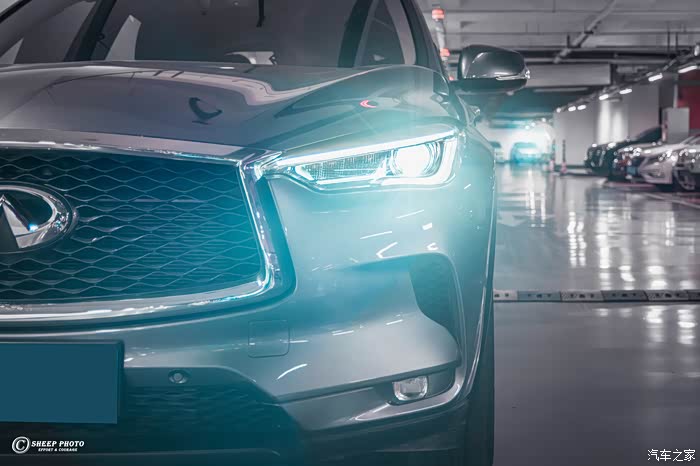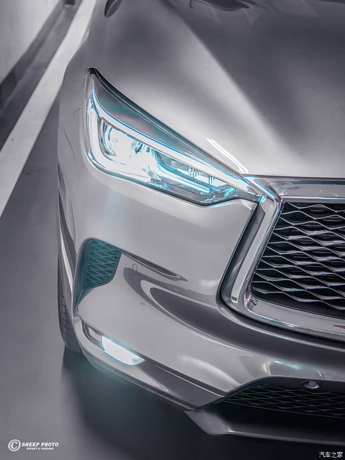 认识一款车总要从外观开始,看惯了欧系、美系的传统设计,英菲尼迪能给人一种不一样的优雅和舒适,方到现在不算过时。家族标志性进气格栅特别大,两侧相连的是深邃的全LED大灯组,灯组功能比较常规。除此之外,前保险杠和两侧进气口的设计也十分犀利,就我个人而言,这个前脸造型是英菲尼迪QX50最成功的地方。