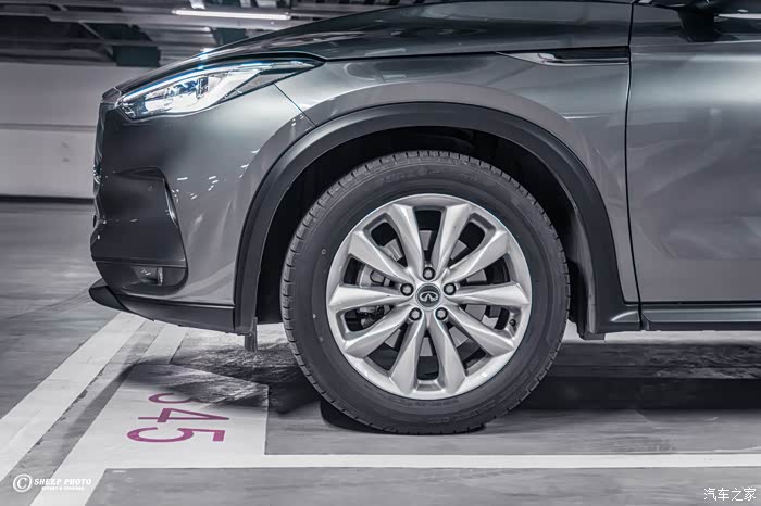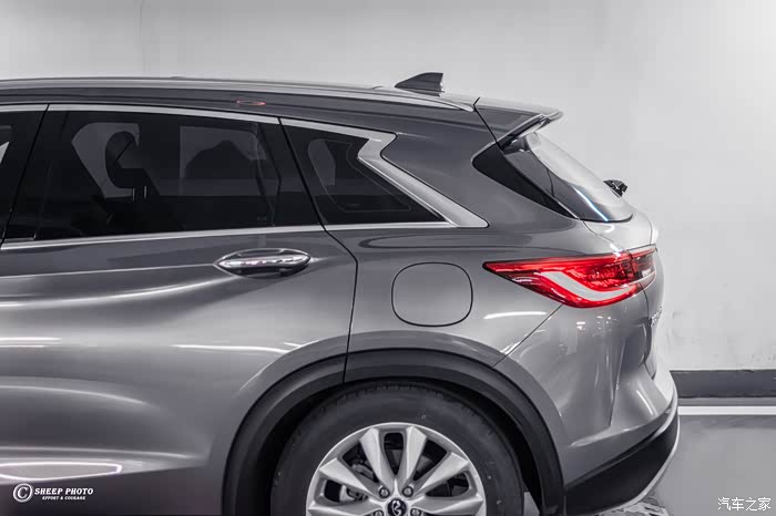 我们将视线转向车侧,英菲尼迪QX50的车身线条硬朗,不失时尚和优雅,并且D柱的镀铬拐角很有亮点。因为是入门版车型,所以轮毂造型比较简单,大小也为19英寸。还记得我开头和大家讲到的WAVE车型吗?英菲尼迪特意为它安排了银色后视镜外壳、以及灰色哑光车漆来增加车子的辨识度。