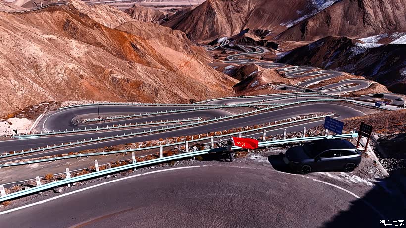 虽然盘龙古道是个网红打卡地,但对于爱驾驶的人更是一段难得的“赛道”。它全长30公里,却有超过600个S弯道,海拔从3000米攀升至4200米以上。对于我们的座驾极狐阿尔法T5来说,这样的路段,开起来确实酣畅淋漓。方向盘转向精准灵活,应对连续发卡弯显得游刃有余。电池组位于底盘下方,带来的低重心加上前后独立悬挂,让车辆在过弯时更加稳定,减少了侧倾感。在弯道最密集的“大盘龙”和“小盘龙”观景台,我们停车飞无人机。从空中俯瞰,公路真的像一条巨龙盘卧在山间,黑色柏油路与土黄色山体形成鲜明对比。高原上气温很低,还好T5的方向盘和座椅都带加热功能,这个时候就派上用场了,显得格外贴心。