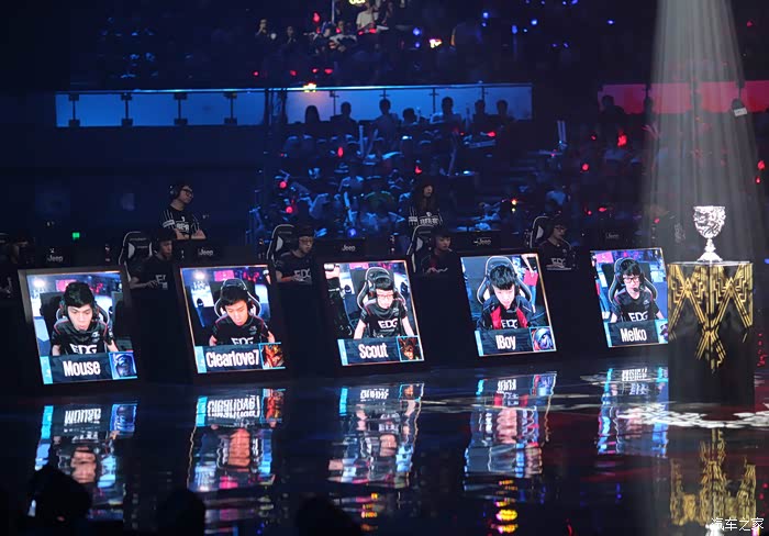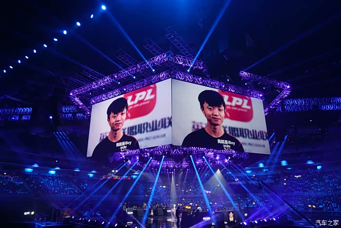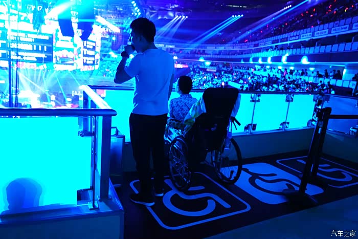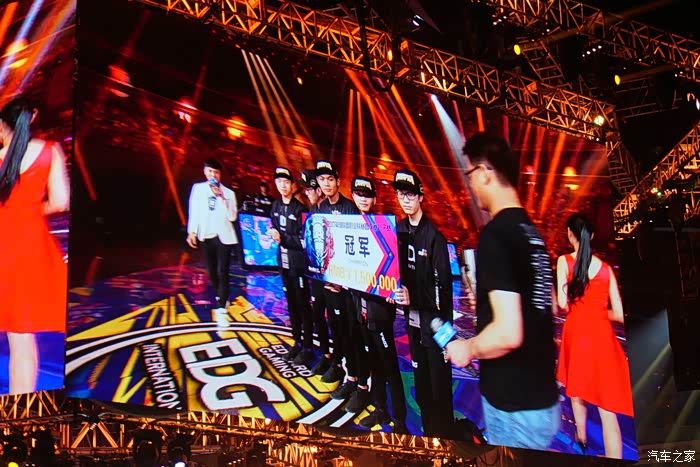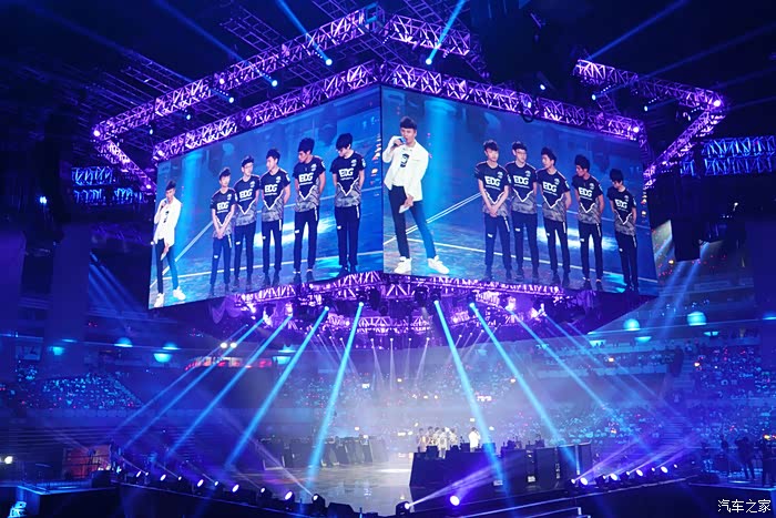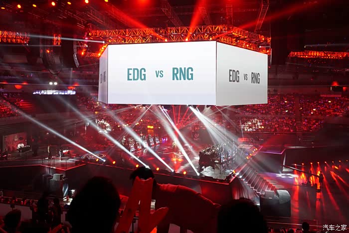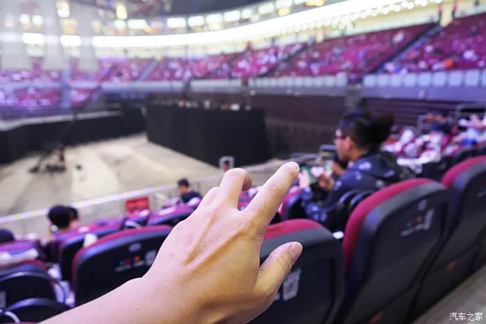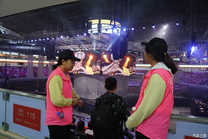 比赛选手开始进场,我坐的位置比较尴尬,刚好在两个屏幕的中间,很容易产生朱桢旁边还站着一个队伍的错觉……怎么十个EDG的对员呀?所以我决定不按票的座位坐了,找个合适舒服的位置来坐。。。