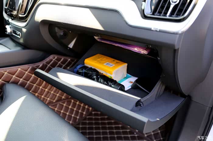副驾驶位手套箱,内部有植绒防滑,放一些小件杂物非常的不错