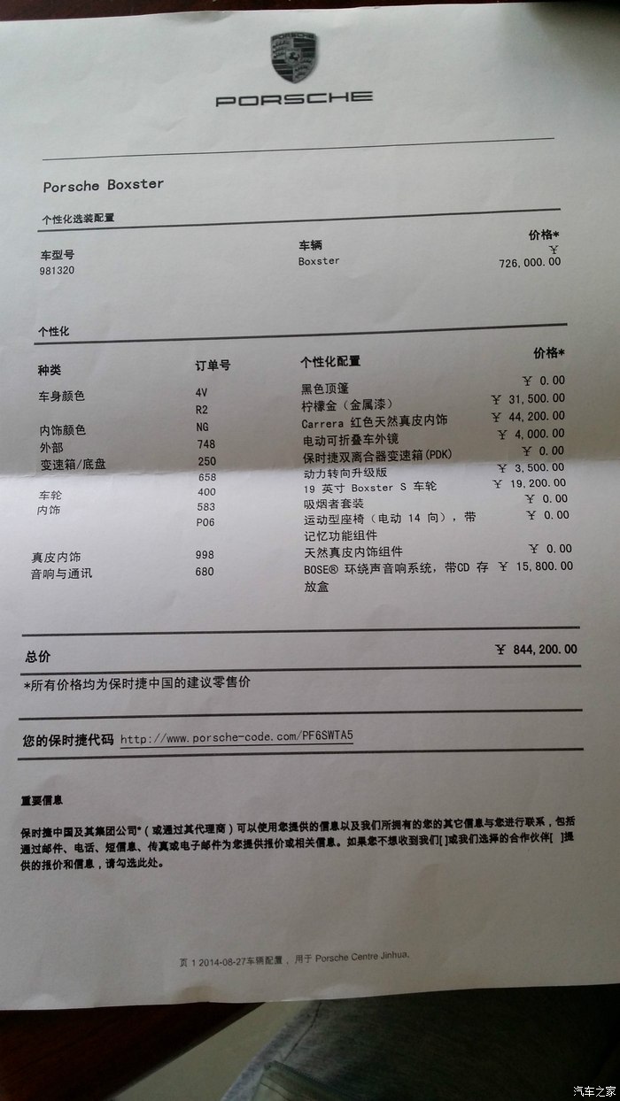 我们是8月26日定的车,定车的那天比较急,因为老妈比较看好柠檬金,正好销售顾问说9月12日会有一辆到港,但也是仅此一辆的柠檬金,所以就毫不犹豫地定下来了。 红内+黑顶+19 英寸Boxster S 车轮+后视镜折叠 +动力转向升级版+BOSE音响,杯具的是等了一个月才提到车……