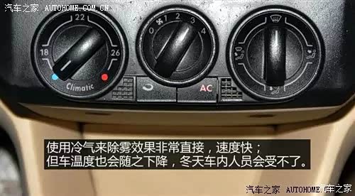 平常的做法就是打开车内的风扇和制冷开关,这样冷气吹到玻璃上很快雾气就会一散而尽,效果很快很直接。这是因为冷气吹到玻璃上,在玻璃表面形成一道“寒气膜”,起到除雾效果。这个方法有一个最大的弊病,就是车内的人可能会感到很冷,吹几分钟可能就会关掉冷气,不一会雾气又开始挂在玻璃上,又开冷气……这样反反复复的操作不方便而且车内温度会很不适宜,另外低头操作对安全造成了一定得隐患。