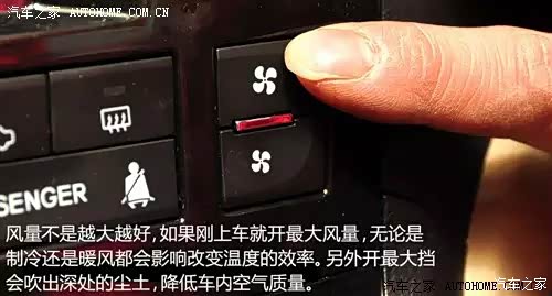 空调的风量使用要适中,即便迫切需要改变温度也不要一下子将风量开到最大挡,因为这样可能会适得其反,让温度变化的更慢。如果是冬天,防冻液温度还没有上升到正常值,暖风水箱也是凉的,这时如果再让鼓风机疯狂旋转,那么刚刚攒出来的那点热气就都被吹走了,这样也不利于发动机的辆车预热,对车和人都没什么好处。如果在夏天也是同样的道理,压缩机刚开始工作时如果把鼓风机开最大挡,也会减慢制冷。
