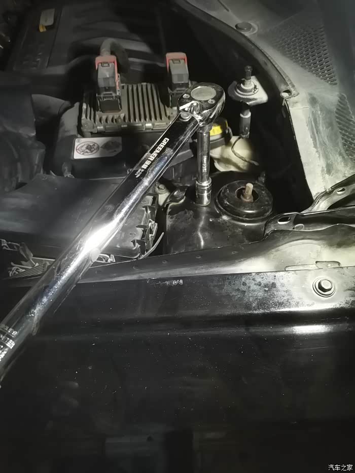 车开着过坑或者减速带时,左前方能听到咯吱咯吱的声音,伴随着咯噔咯噔的响声,到朋友的修车点检查了下,说前减震顶胶不行了,车在原地,上下晃,减震顶胶中间的柱芯跟着晃动。周围还有黑色的橡胶碎末,看来减震顶胶真的挂了。