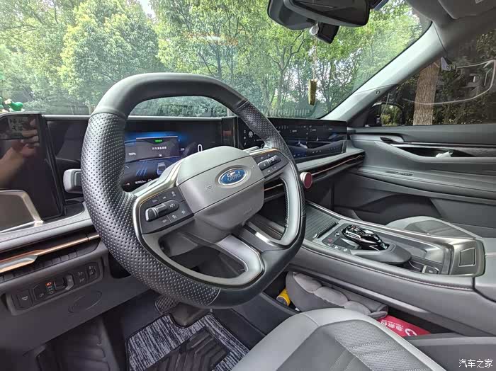 内饰的话,锐界L给我的第一感觉就是豪华感十足,而且设计感也是满满的。中控屏幕很大气,日常听歌、导航、语音控制都挺实用的。飞行档把看着挺有质感的,还有一块无线充电板,手机放上去可以补一些电。座舱营造出来的豪华氛围感,在同级中也是数一数二的。