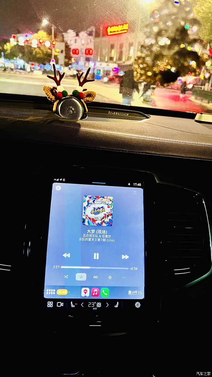 今日掐指一算,新车掐逢满月,开了1333公里,油耗10.5,在正常范围。有几点感触:一是空气悬挂质感不错,滤震效果满意,中等稍偏硬,日常使用选了舒适模式。二是安全性良好,倒车时主动刹停3次及时强硬刹停,第一次吓了一跳;还有一次在100公里的时速时想往右方变道,恰巧有个右后方来车在盲区,XC90立即在右后视镜外1/3出闪亮橘黄色灯光伴急促“滴滴”警告声响,同时车机抢夺方向盘,方向盘自动左旋,成功避让,又吓了我一跳,这次避险让我体验到了沃尔沃citysafety的威力,安全性值得信赖。三是宝华韦健音响效果不错,中高音较好,适合听人声、中高音乐器,听音位置有驾驶位、前排、后排、全员等不同选择,还有音乐厅、环绕声等选择。失真度低,久听不累,确实是家用车音响的天花板水平,音箱、功放、线材、音响的空间设计、调试,出厂前已经基本固定,我们要做的是提供高品质的音源。音源的质量决定入耳的效果。试了几种方法,个人觉得通过U***- C连接苹果手机,使用苹果自带音乐软件比较好,音质选无损,每首歌曲大概100多兆,才能发挥宝华韦健的优势。也可以使用百度云下载高保真母带音乐,通过carplay播放,效果也很好。四是手机遥控很好用,冬季寒冷,提前5-10分钟远程打开空调,上车后发现方向盘没那么冰手了。目前并不后悔没有选装方向盘加热。五是隔音效果一般,不算差,也不能算好,高速跑起来还是打开音乐吧,瞬间被美妙旋律包围的感觉真能治愈少许噪音带来的不适。马上到圣诞节了,昨晚路口等红灯时随手拍照一一张,还真有点圣诞节的气氛,祝?各位车友圣诞快乐🧑?🎄