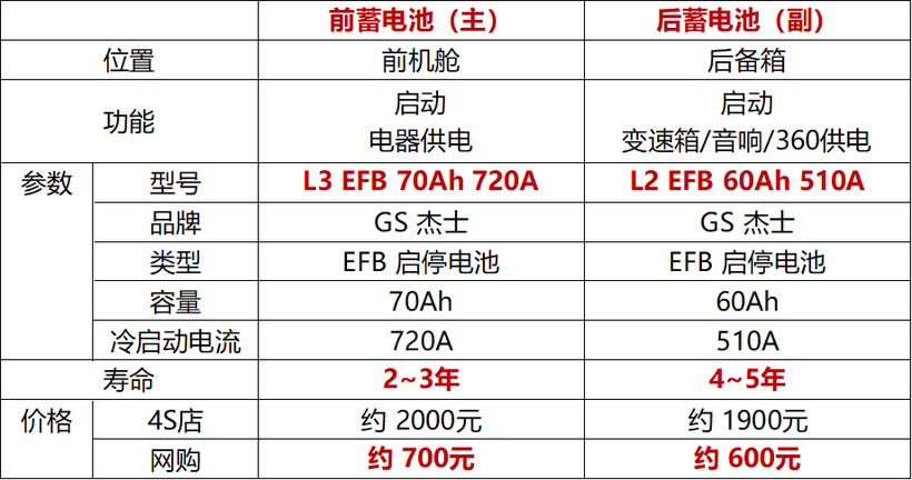 蓄电池绝对是个大消耗品,我现在8万5千公里,但是前面电池换过2次、后面电池换过1次,所以开10万公里至少得准备2前+1后。对于蓄电池来讲,就没有必要去4S店换了,直接去电池店最划算。费用2个前电池 700x2=1400元,1个后电池 600元,一共2000元。电池的参数型号之前有整理过,直接看下面的图片就可以。