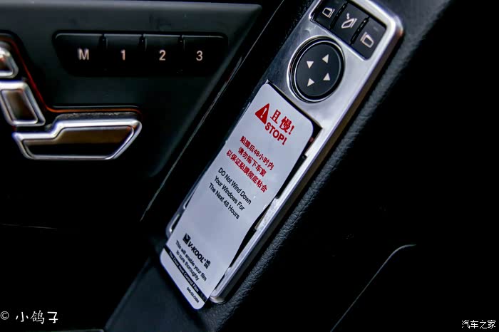 因为贴膜后膜还没有干透,升降车窗可能会损坏防爆膜,因为在贴膜后的48小时内是禁止升降车窗的,车艺尚为客户想得很周到,在车窗升降开关上贴上了警示标签。