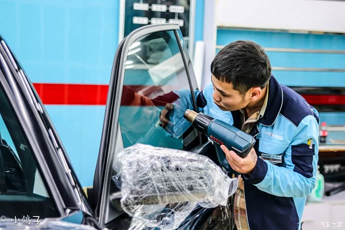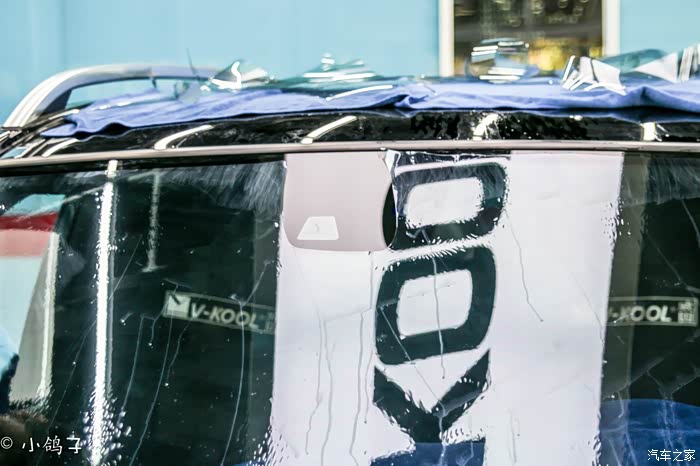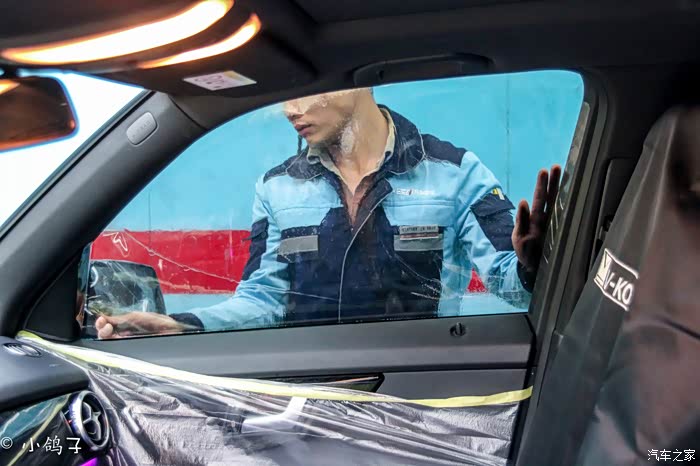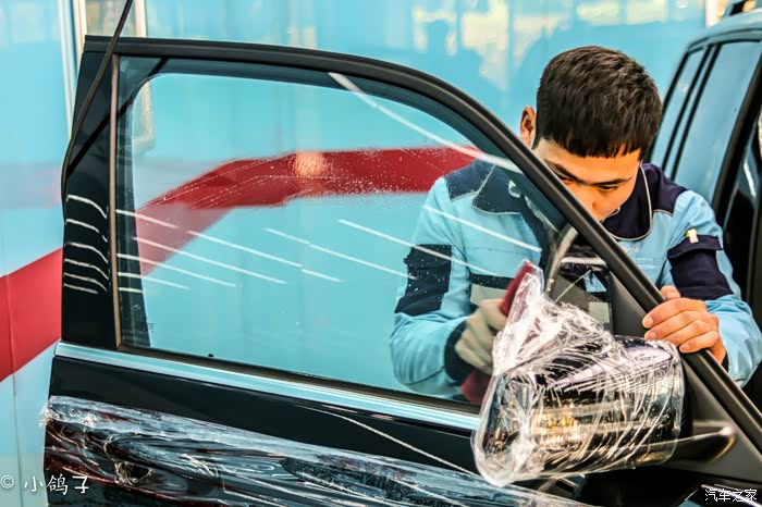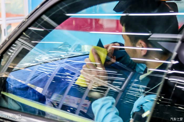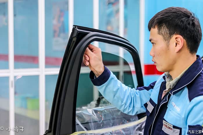 相对与来说前挡是贴膜工作中比较难的,侧窗和后窗相对要容易一点,但是上面的工序确是一步也不能少的,贴膜师傅(火拳艾斯)同样尽心尽力,将侧窗膜贴上。