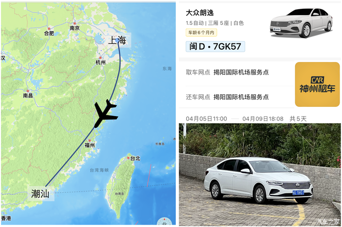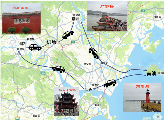 我这次租车采用的是全程自驾,机场借,机场还。下面这张图就是我的行程路线图。5天的时间的行程,第一天上海飞潮汕机场,下了飞机取车,自驾先到了潮州市,第二天潮州+汕头的南澳岛,第三天南澳岛环岛,第四天在汕头市区,最后一天去了揭阳市,晚上还车飞回上海。得益于有自驾车,去这些地方路上时间节省了不少,存放行李也比较方便。