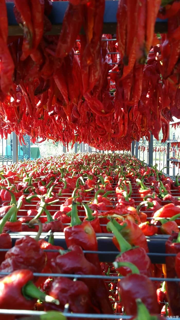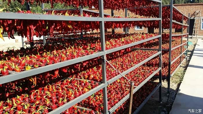 园子里全是自产的辣椒,一排排红辣椒整齐的摆放在架子上,好壮观,好有画面感。