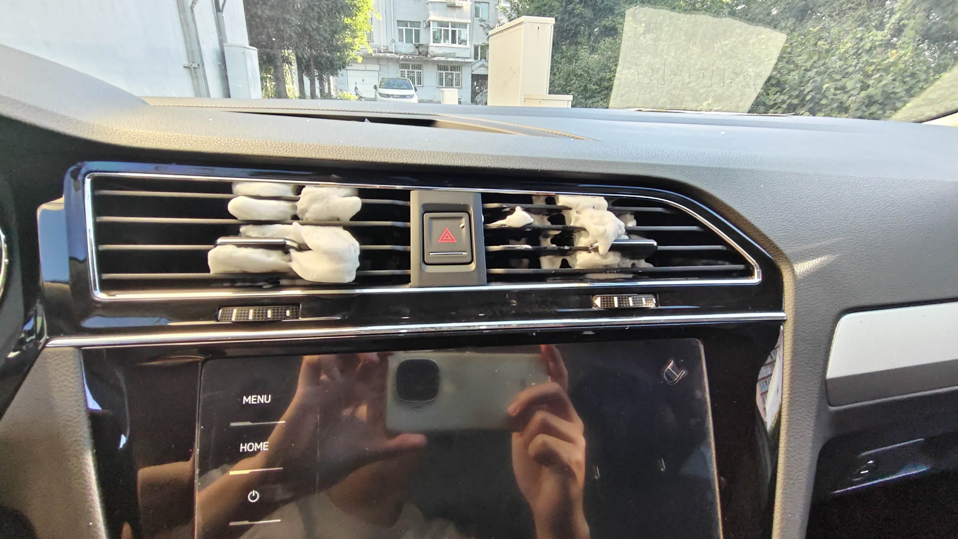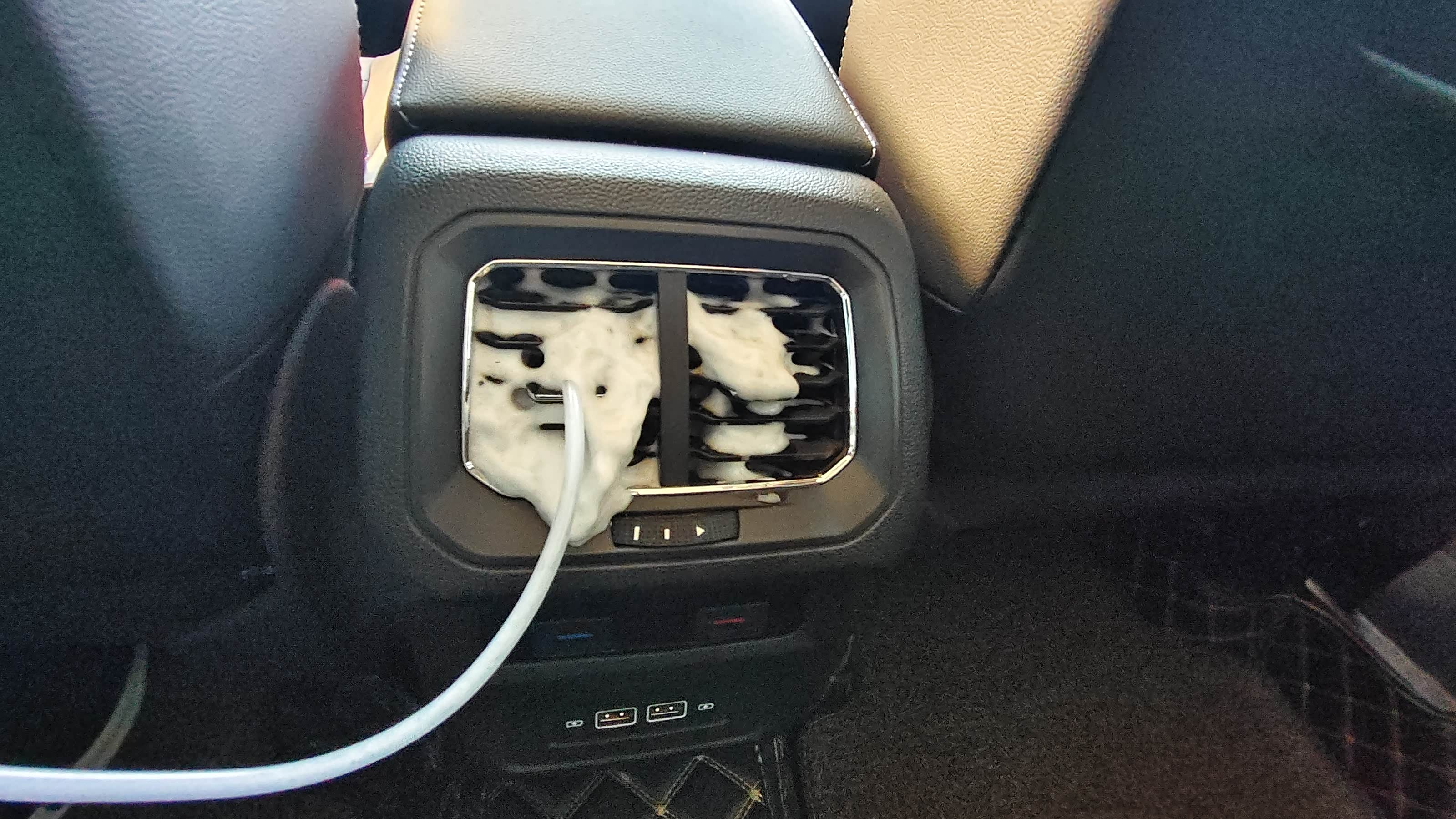 清洁空调鼓风机还剩下一些空调泡沫清洁剂,我把泡沫清洁剂软管通过空调出风口,伸到空调管路深处,然后把泡沫清洁剂喷出,这样车辆各个空调出风口端的空调管路也都利用空调泡沫清洁剂进行二次清理,这样清理效果会更明显。