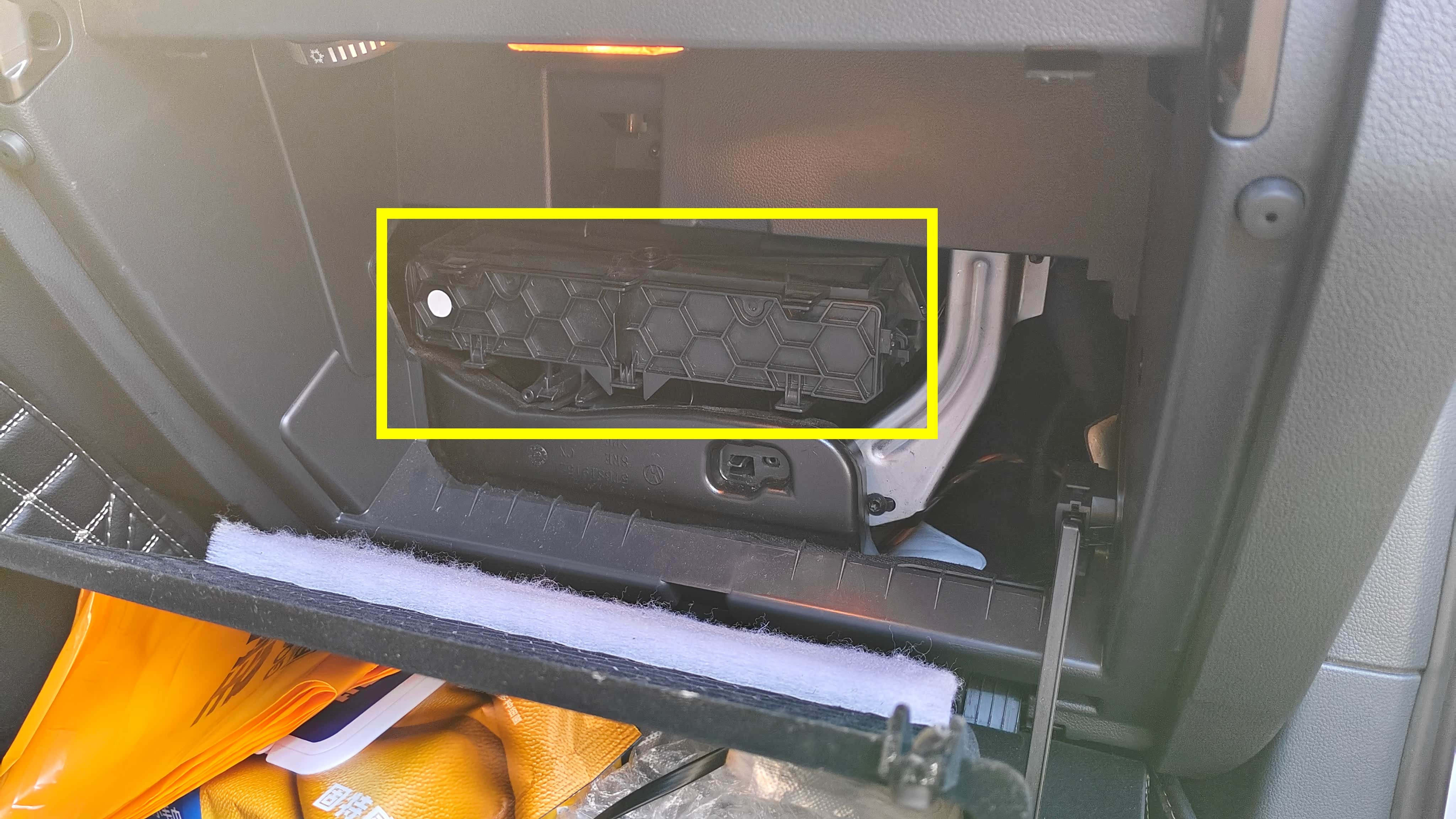 放平手套箱,就能露出图中圈中的空调滤芯挡板,挡板上侧有三个卡扣,分别把卡扣打开,可以将挡板拆开,这时候就可以将空调滤芯向外拉出清理或更换。