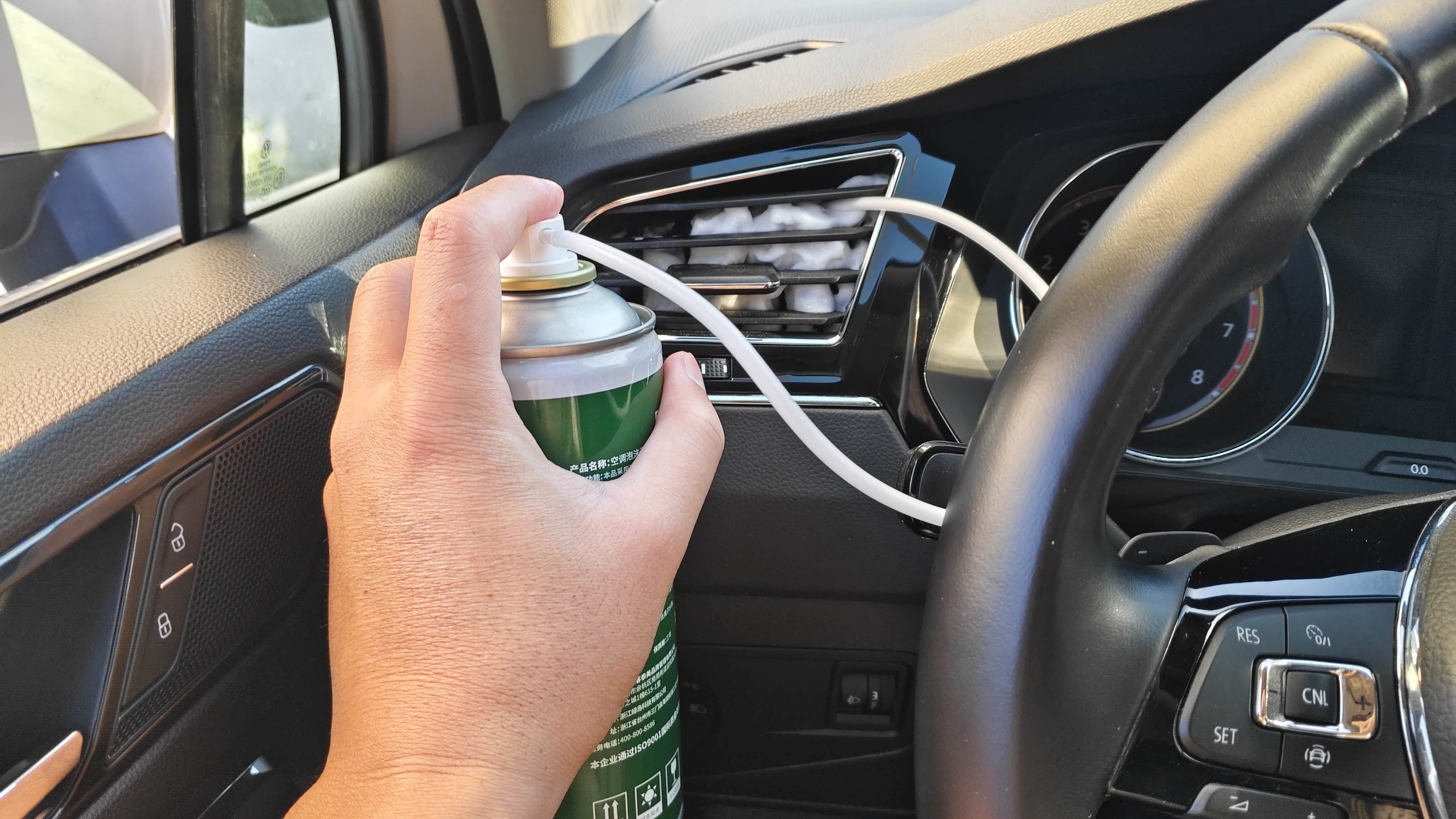 喷洒完空调泡沫清洁剂后,等待一两分钟让清洁剂充分溶解污垢,然后再次开启车载空调并打开空调制冷模式,这时候同时需要将所有车窗玻璃降下来,保持车辆空气流通,将空调出风量开到最大,工作大约六七分钟,切换空调内外循环模式,继续让空调大风量工作六七分钟,这样空调鼓风机和管路中的污垢和泡沫清洁剂都会被吹干净。