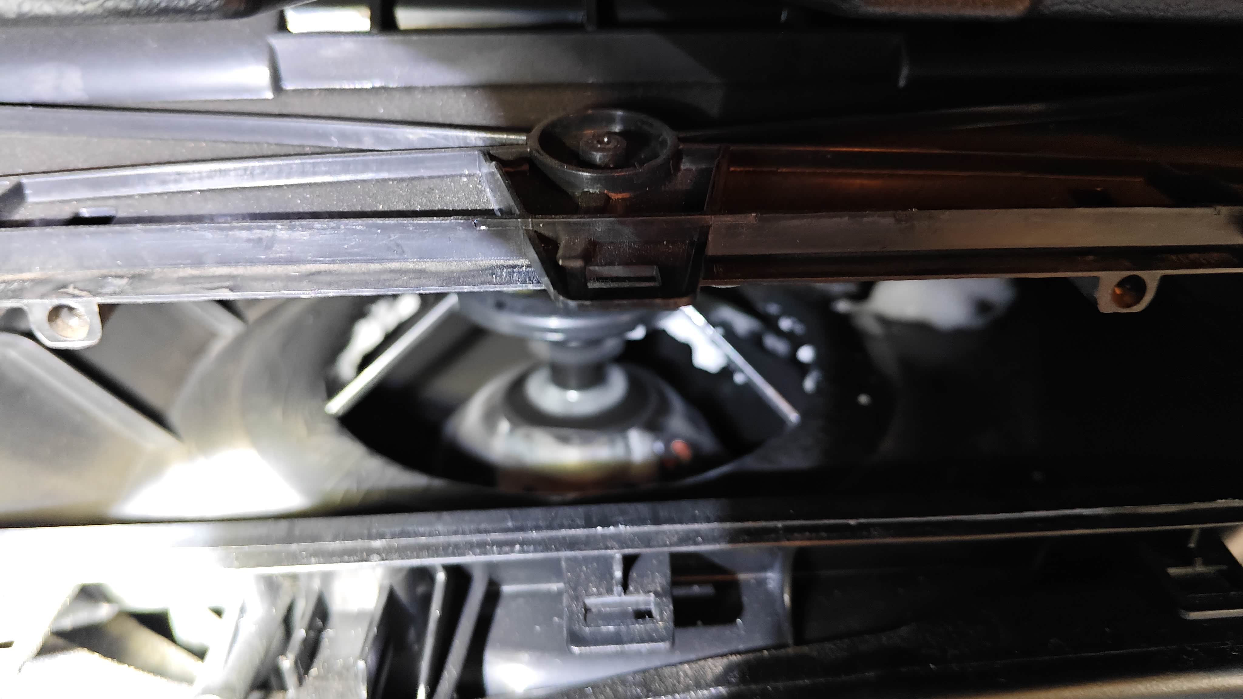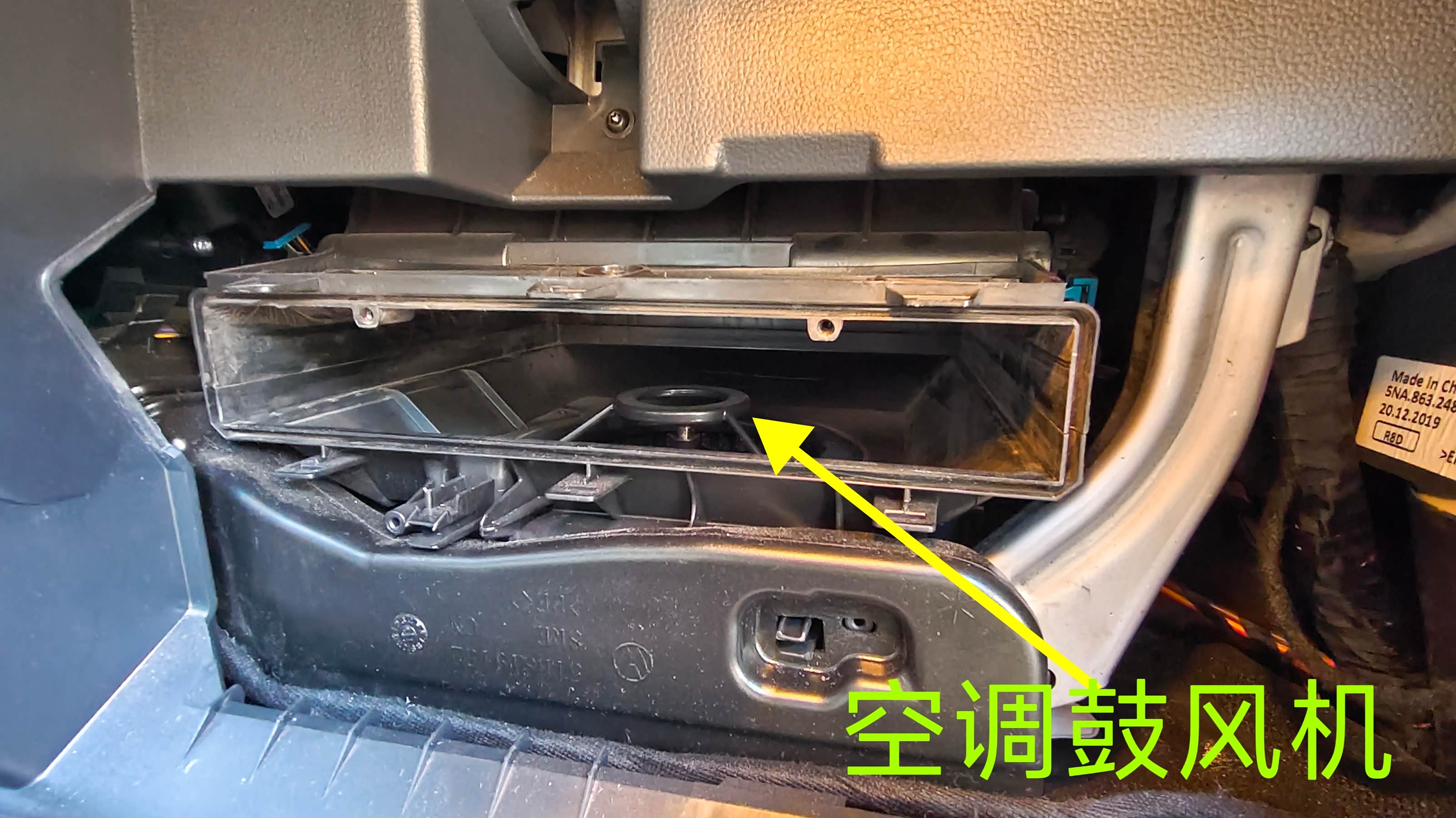 抽出空调滤芯就露出了剪头标记的空调鼓风机位置了,鼓风机可以通过手套箱下侧进行拆卸,那样清理会更彻底,但是需要人钻到手套箱下侧操作。自己是第一次操作所以就选择不拆鼓风机,直接在原位对鼓风机进行清理。