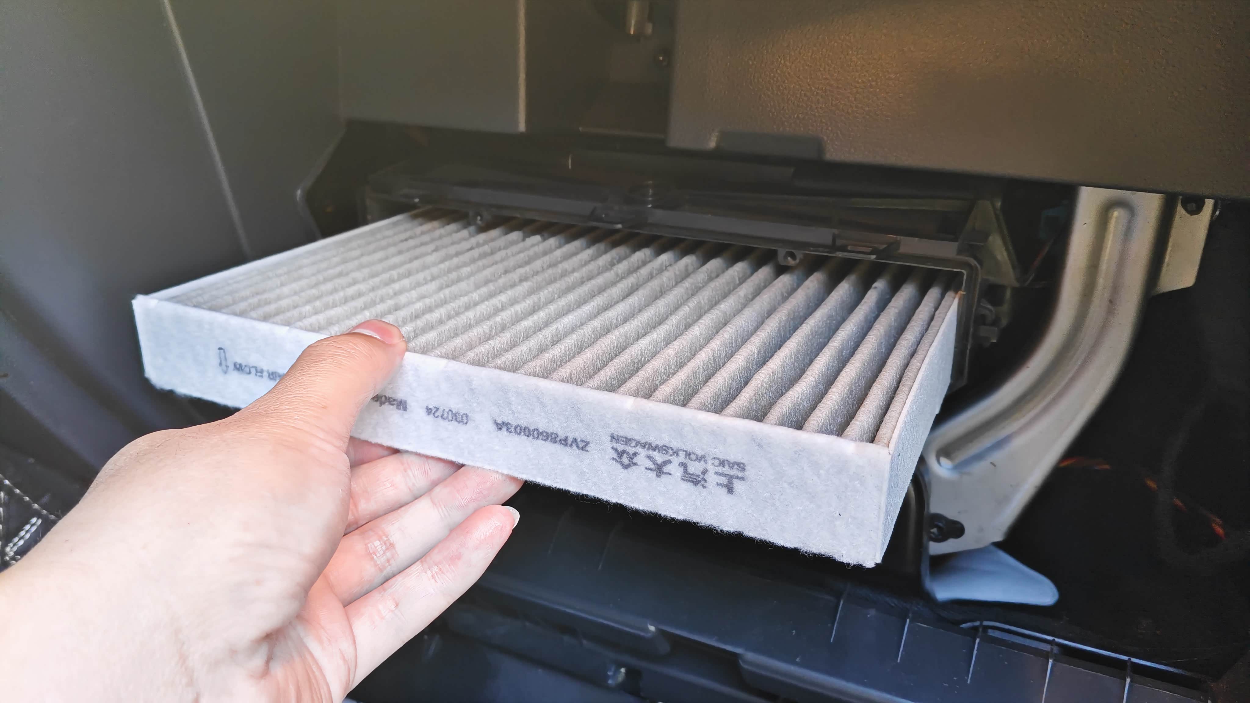 接着把新的空调滤芯或清理过的空调滤芯安装回原来的位置,盖好滤芯挡板,把手套箱复原到原来位置。